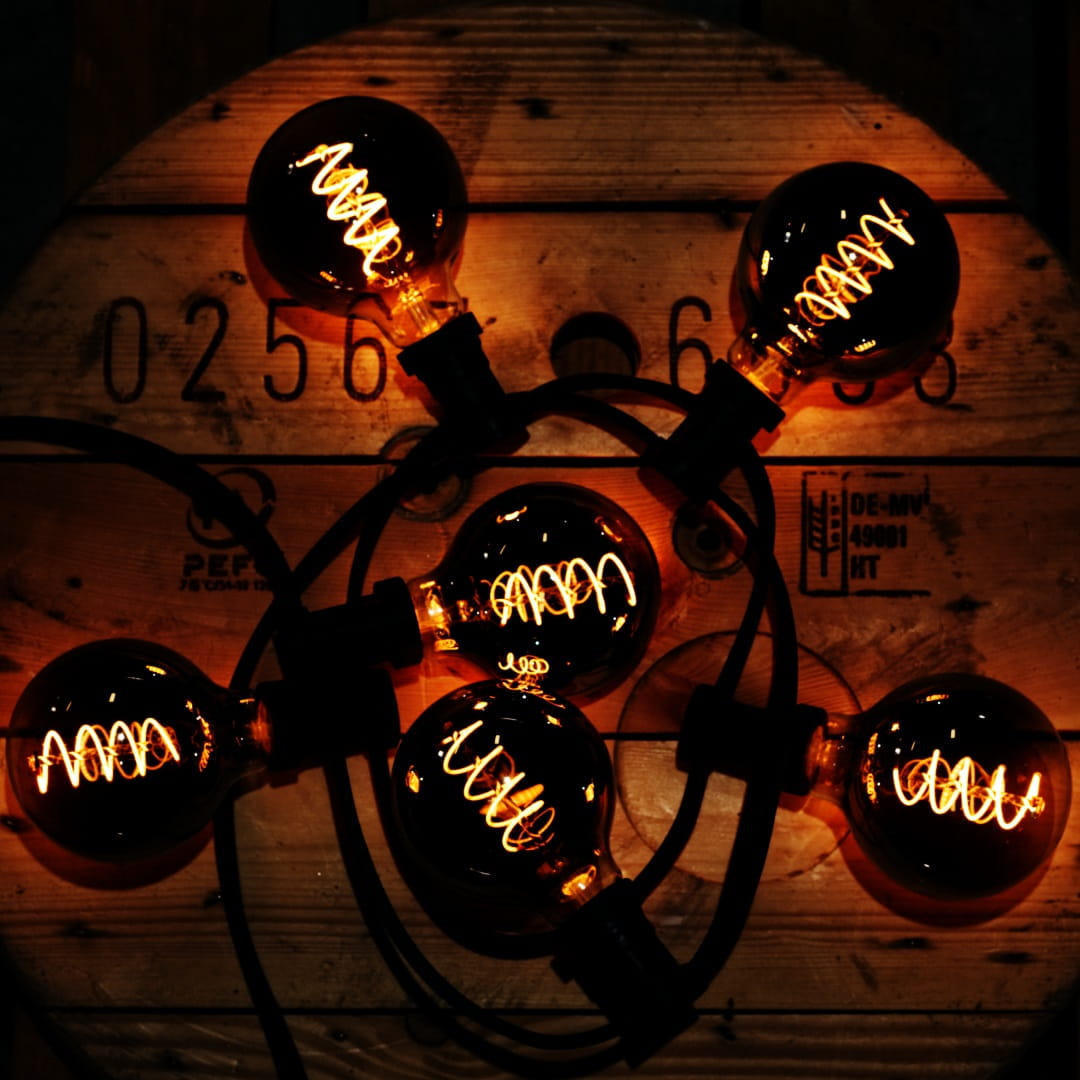 Zestaw dymionych żarówek LED Filament G95 zamontowanych w girlandzie, widok z góry na drewnianym tle, ciepłe dekoracyjne światło w stylu vintage.