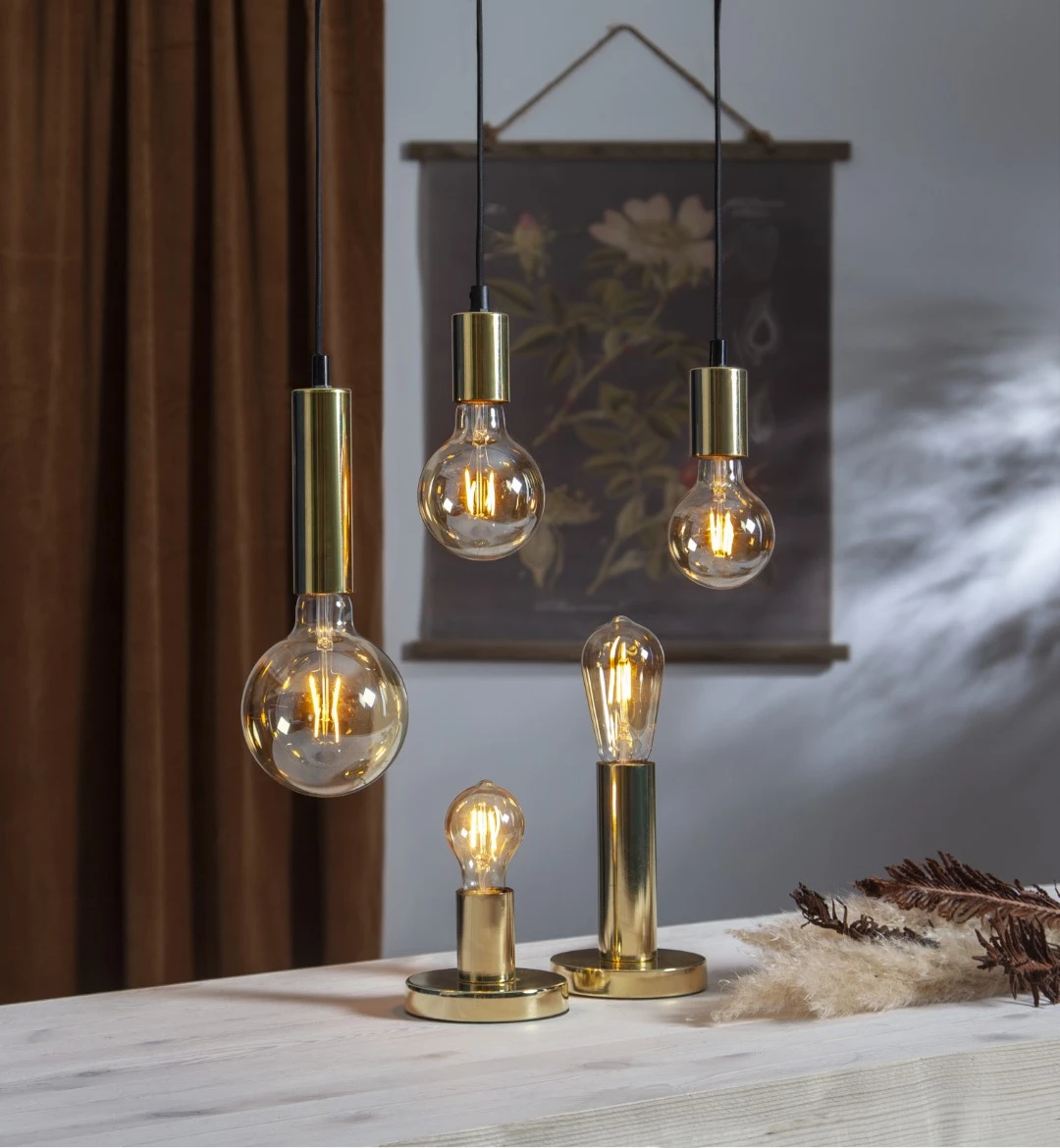 Szkło amber – bursztynowa bańka nadaje żarówce elegancki charakter i dodatkowo ociepla emitowane światło, tworząc miękki, nastrojowy efekt we wnętrzu.