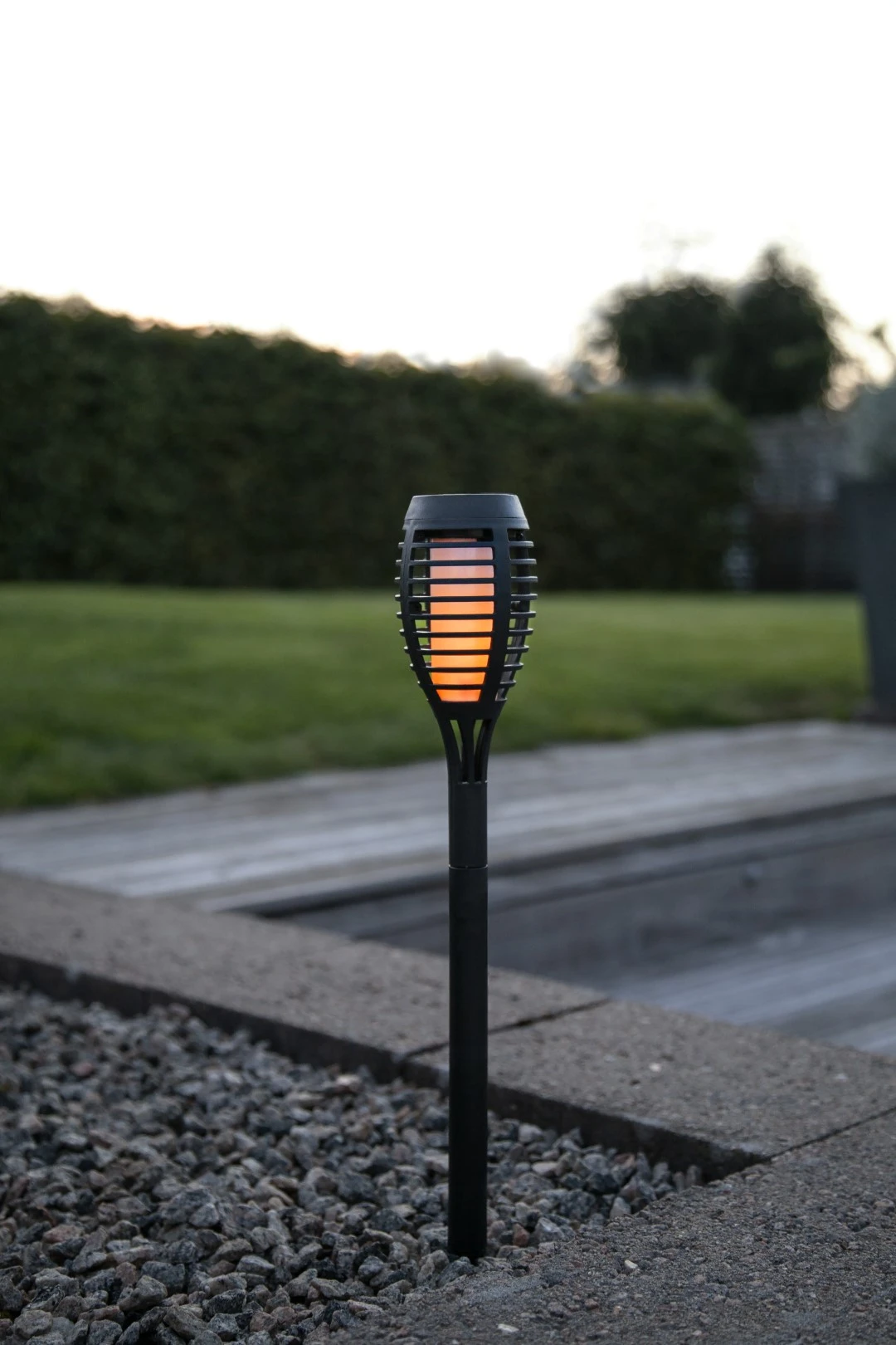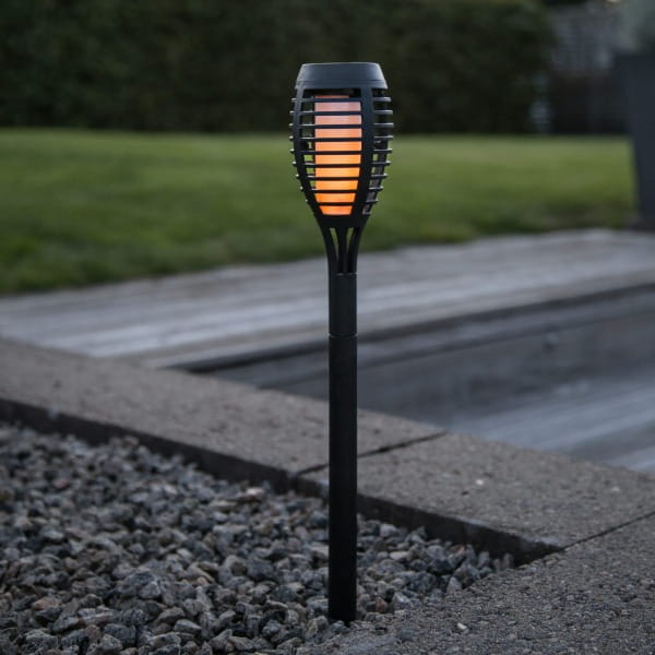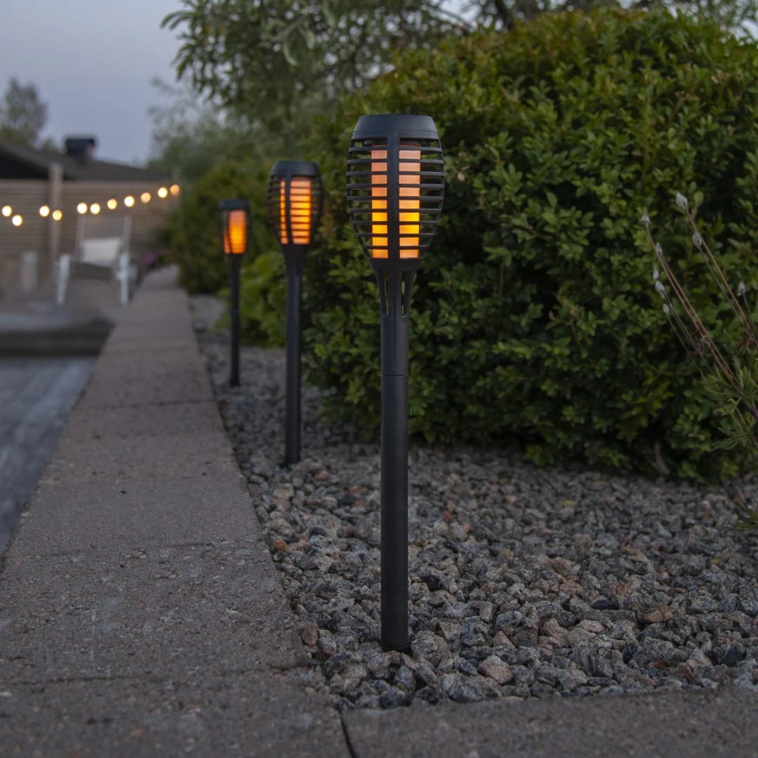 Efekt płonącej pochodni - zastosowane diody LED emitują ciepłe, żółte światło z delikatnym efektem migotania, które realistycznie imituje ruch naturalnego płomienia. Dzięki temu lampiony tworzą przyjemny, dekoracyjny blask idealny do stref wypoczynkowych, wzdłuż alejek ogrodowych oraz przy rabatach kwiatowych.