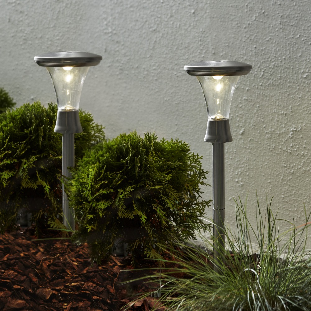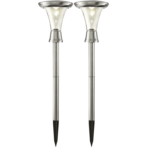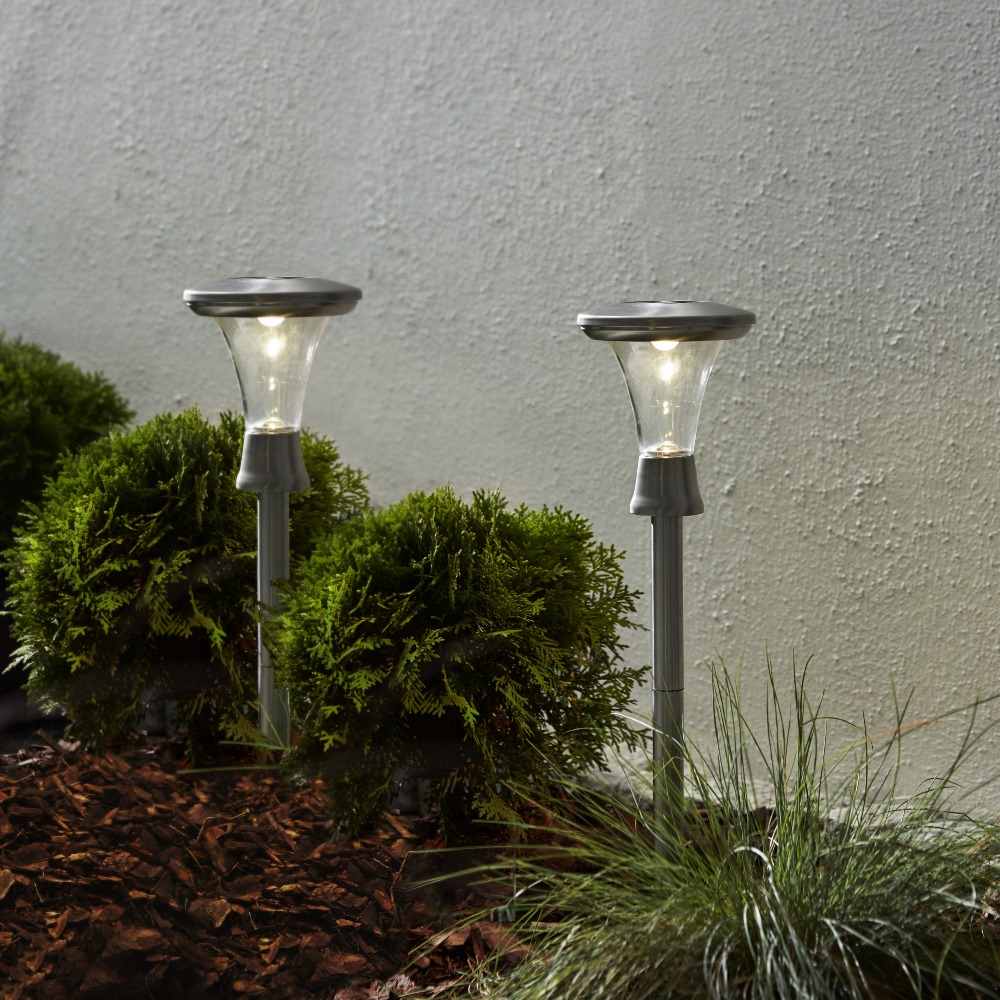 Dwie solarne lampy ogrodowe w kolorze stali nierdzewnej z przezroczystymi kloszami, osadzone na szpilkach, przedstawione na białym tle.
