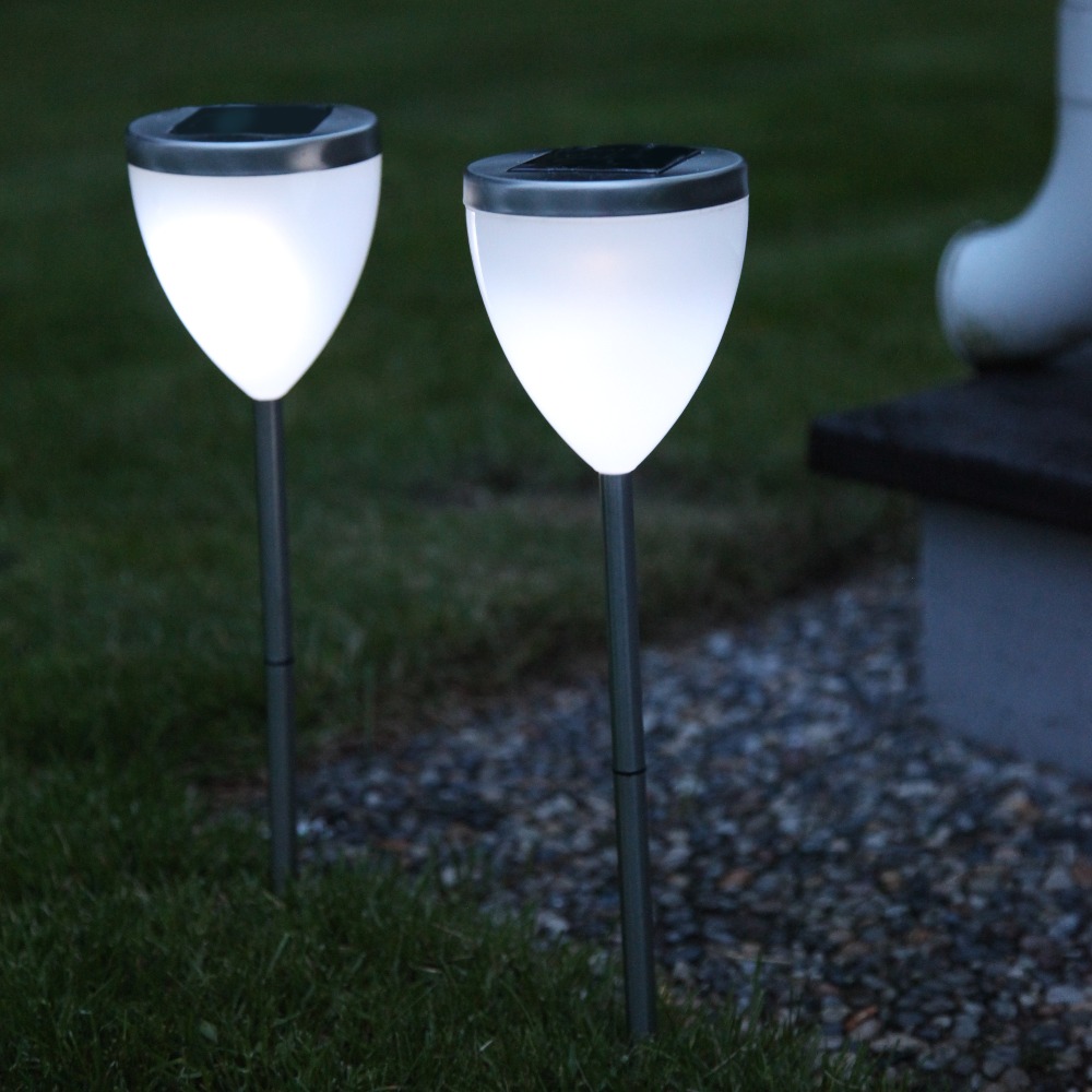 Dwie białe lampy solarne ogrodowe z kolcami do wbicia w ziemię, widok produktu na białym tle.