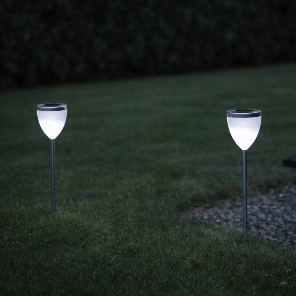 Dwie białe lampy solarne wbijane w trawę przy żwirowej ścieżce, świecące chłodnym białym światłem po zmroku.