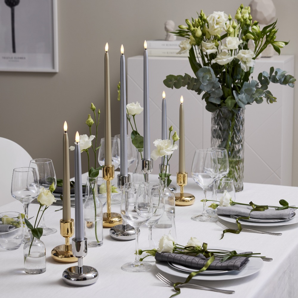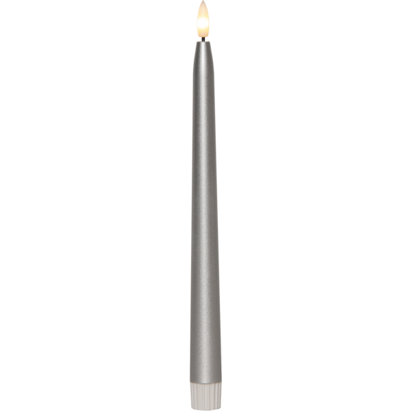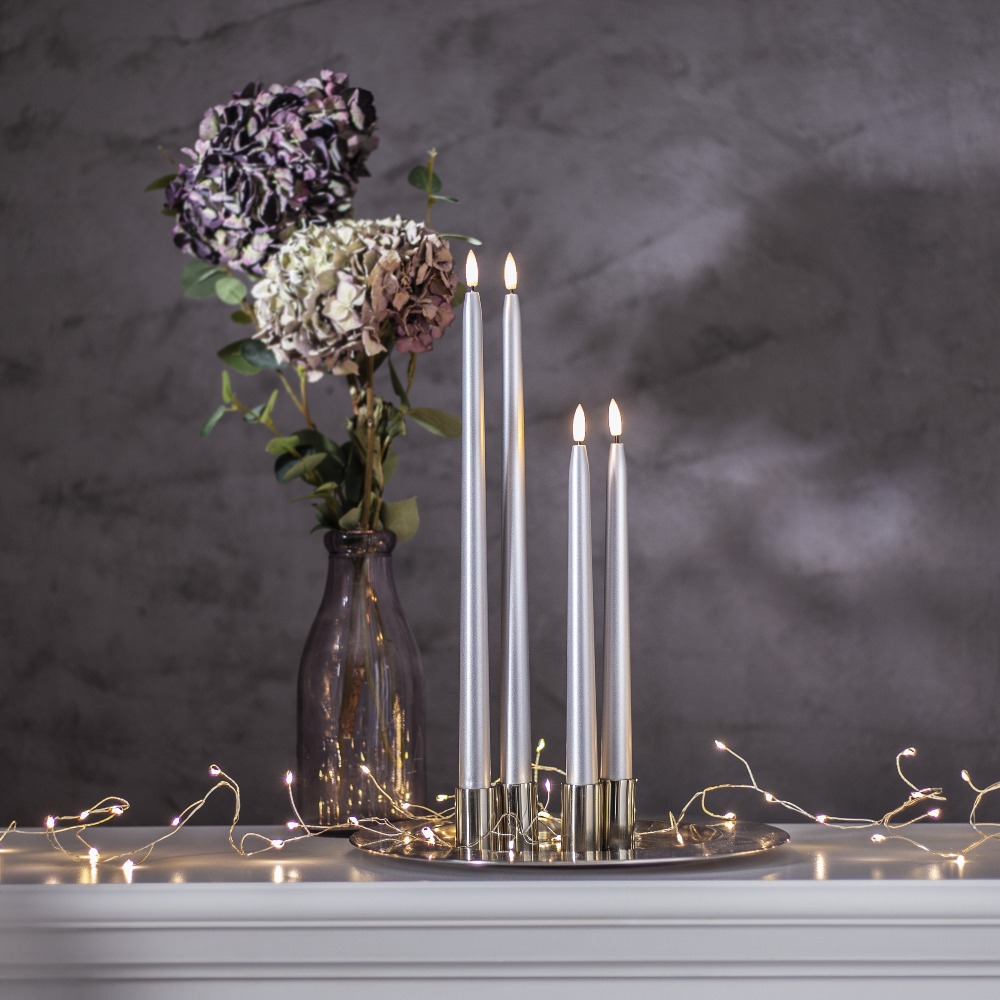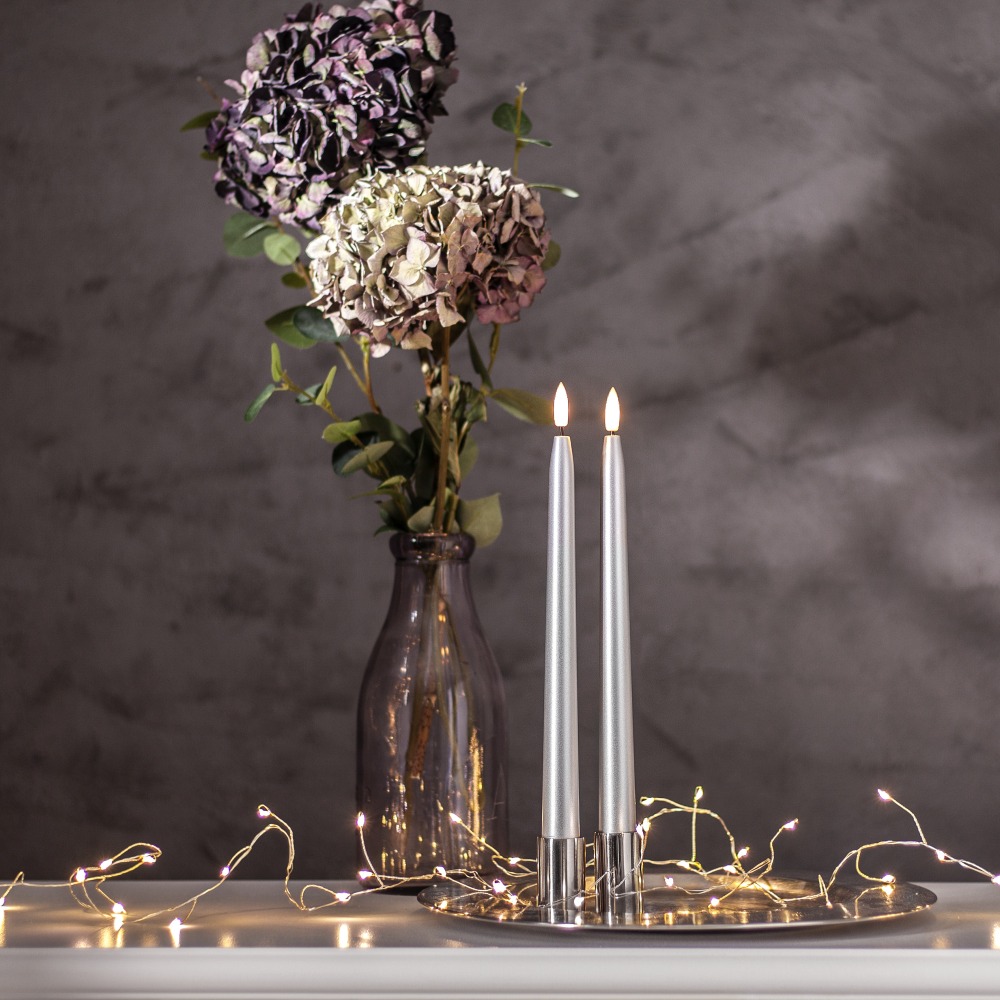 Zestaw 2 smukłych świec LED w eleganckim, srebrzystym wykończeniu to wyjątkowa dekoracja do wnętrz w stylu klasycznym i nowoczesnym. Ich subtelnie połyskująca powierzchnia pięknie odbija światło, podkreślając uroczysty charakter aranżacji – na stole, komodzie czy w świątecznej kompozycji.