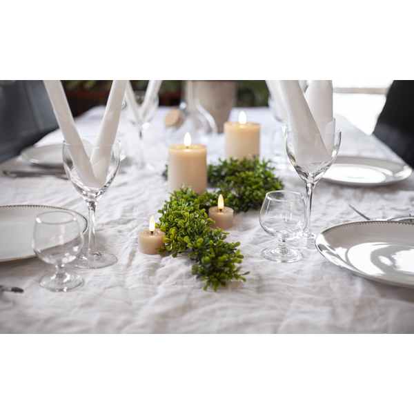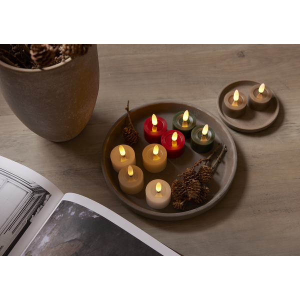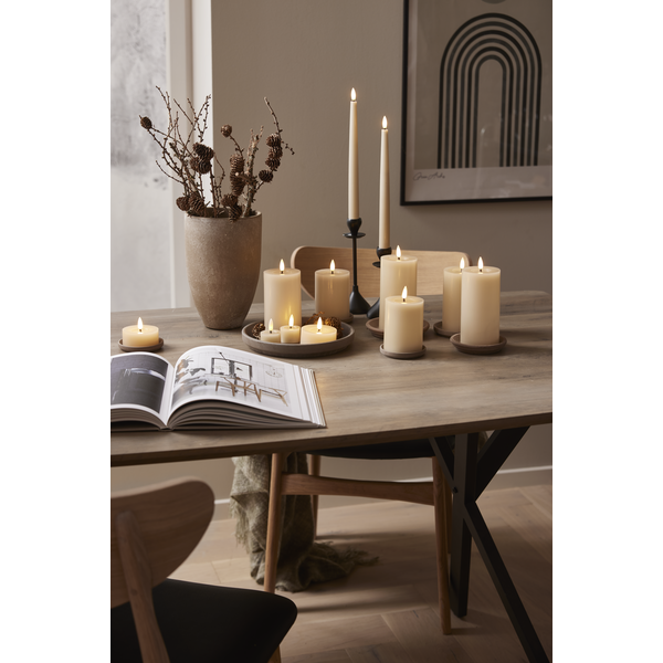 Flamme Flow to elegancki zestaw dwóch świec LED typu tealight, wykonanych z prawdziwego wosku, które doskonale imitują tradycyjne świeczki. Dzięki subtelnie migoczącemu płomieniowi w ciepłej tonacji wprowadzają przytulny i relaksujący nastrój do każdego wnętrza. Minimalistyczna forma i neutralny kolor sprawiają, że tealighty świetnie komponują się z różnymi aranżacjami wnętrz – od nowoczesnych po klasyczne. Doskonale sprawdzą się jako dekoracja stołu, kominka czy świątecznych stroików.