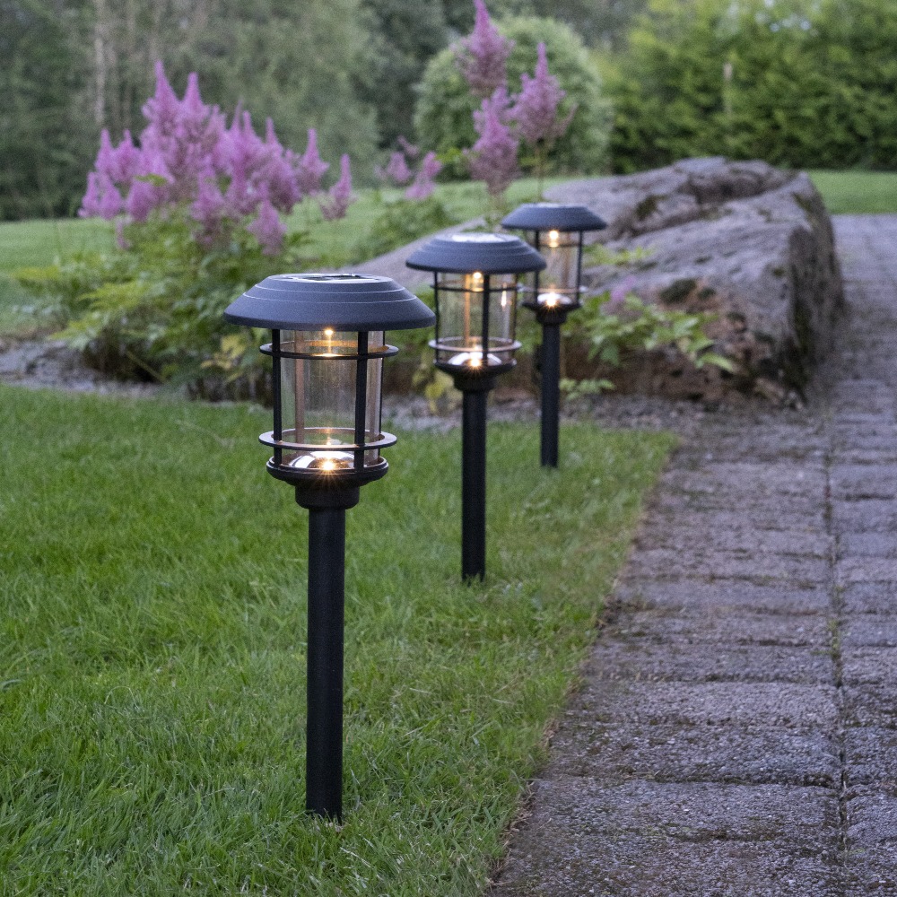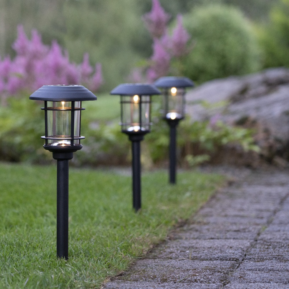 Łatwy montaż w gruncie - każda lampa wyposażona jest w solidną sztycę do wbicia w ziemię, co ułatwia montaż i pozwala na dowolne rozmieszczenie w ogrodzie.