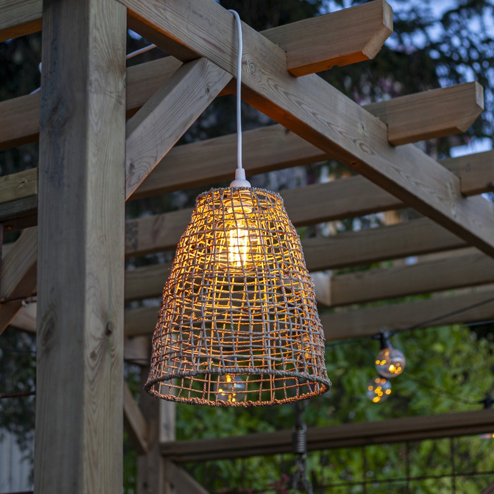 Lampa wisząca z rattanowym kloszem w altanie ogrodowej, ciepłe światło LED tworzy przytulny nastrój.