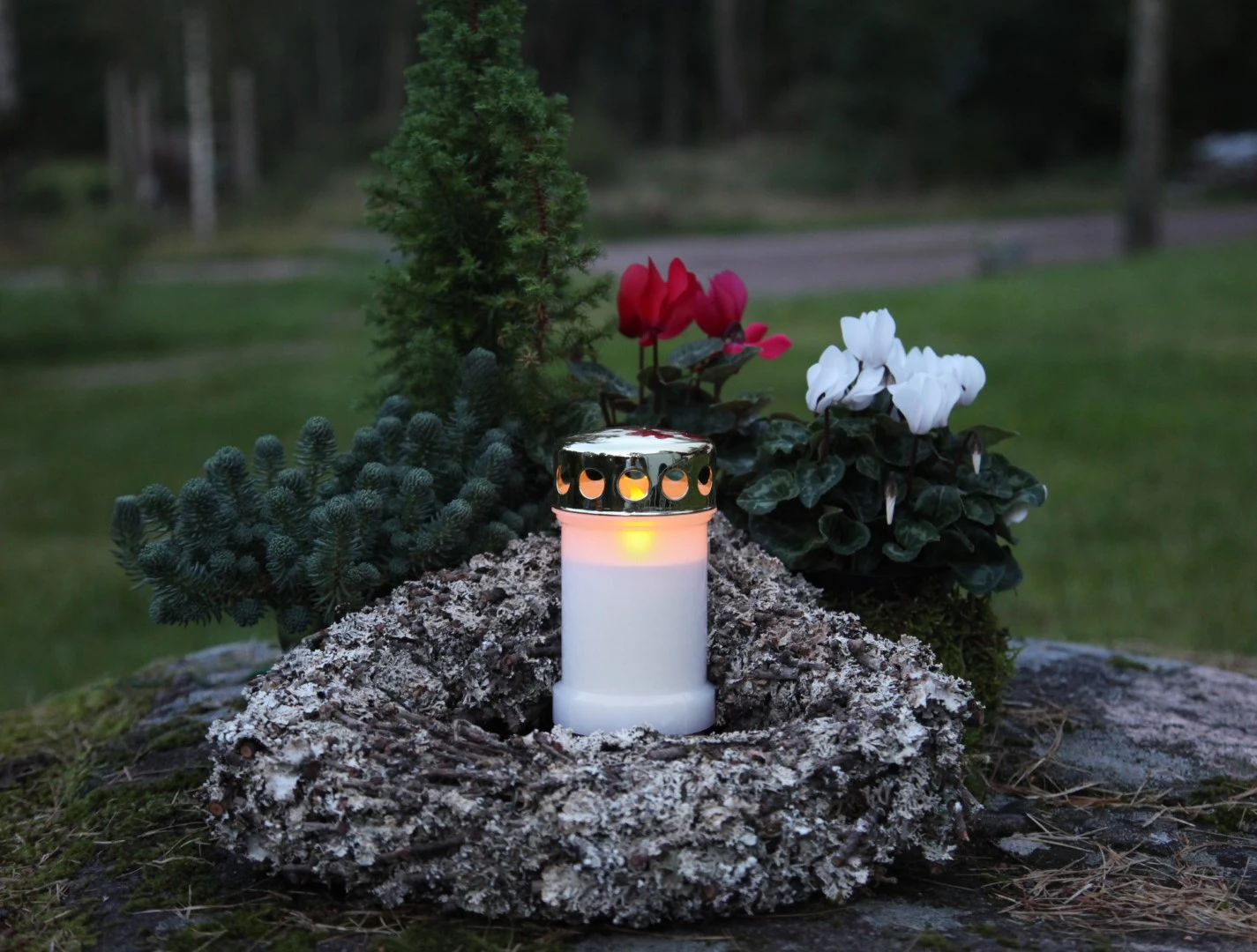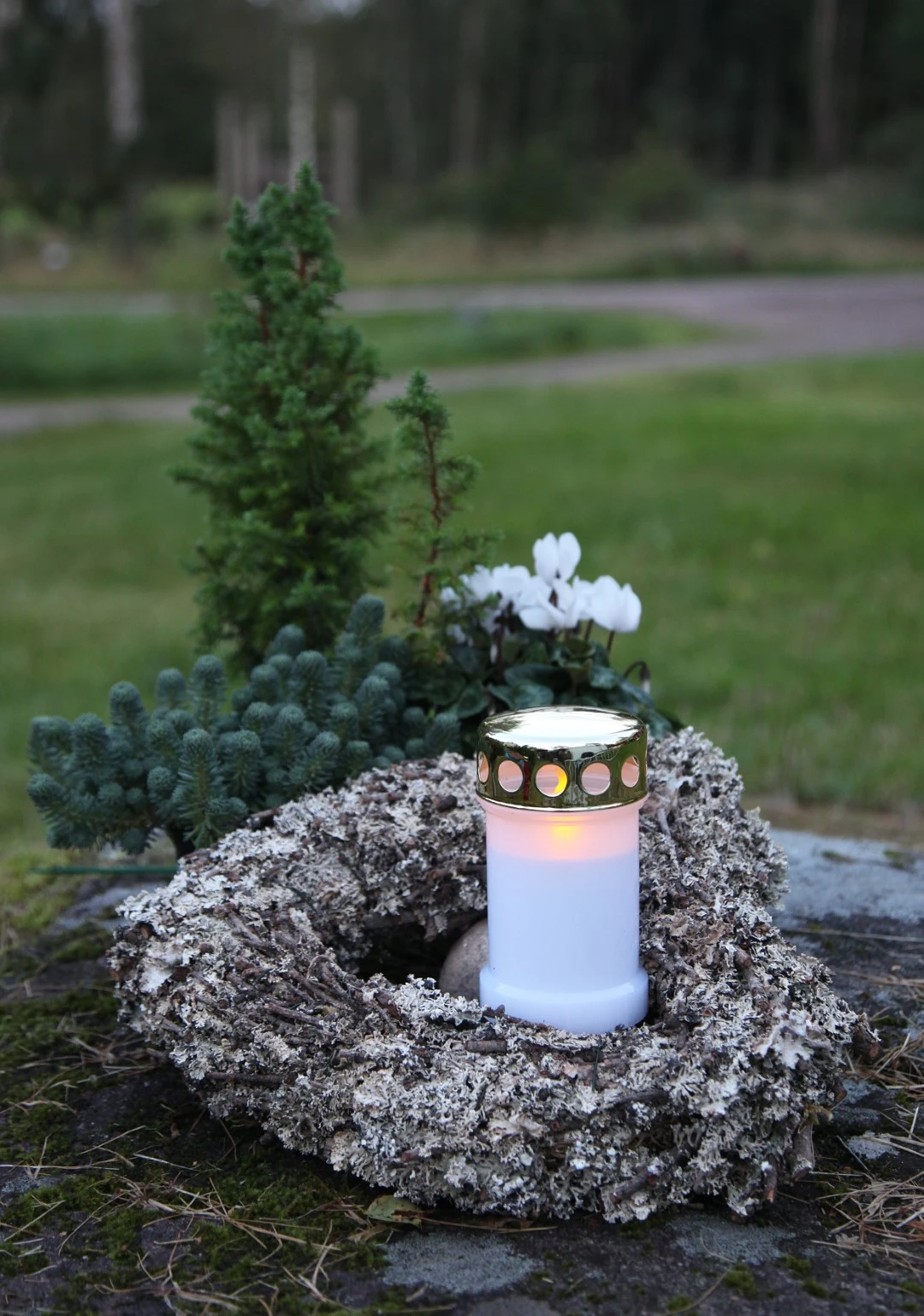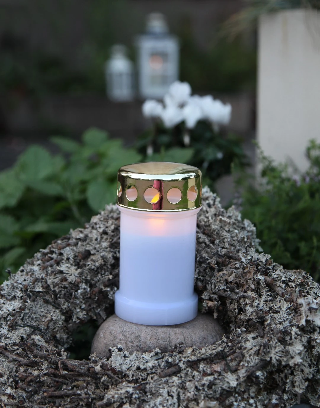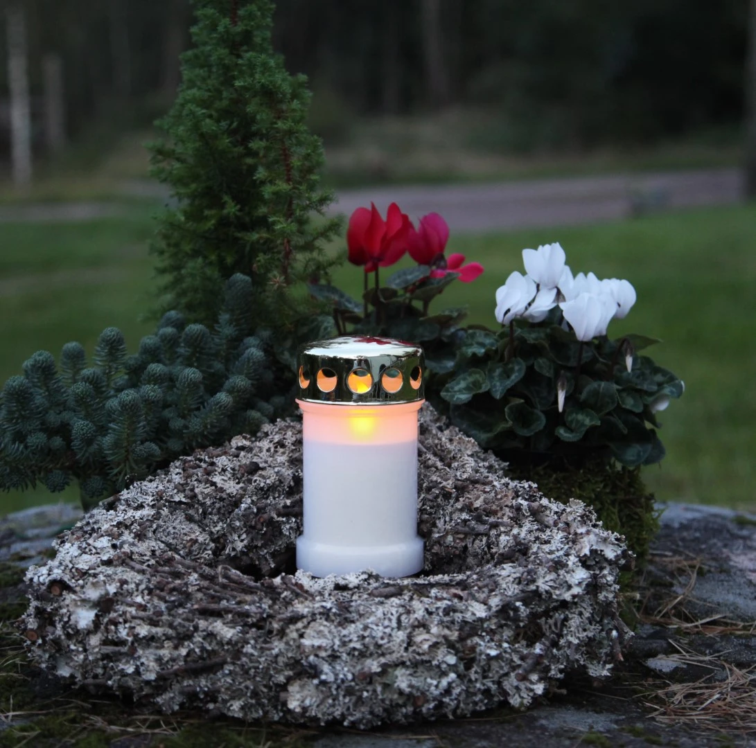 Znicz LED biały z migoczącym światłem, umieszczony w naturalnym wieńcu na nagrobku, w tle rośliny iglaste i białe kwiaty.