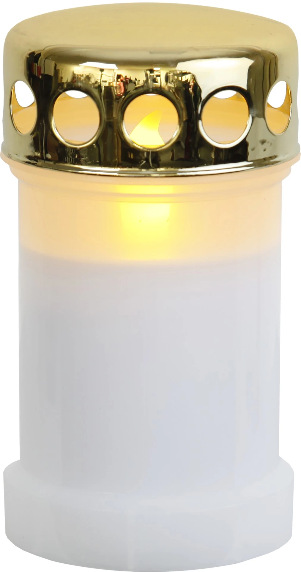 Produktowe zdjęcie białego znicza LED z realistycznym płomieniem i złotą pokrywką, widok zbliżeniowy na detale.