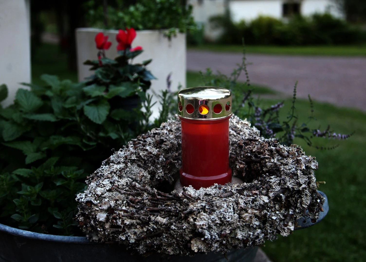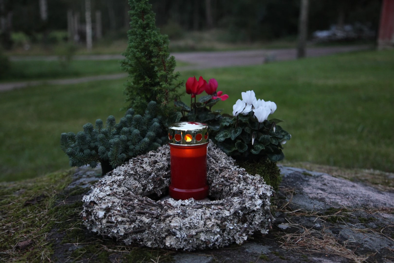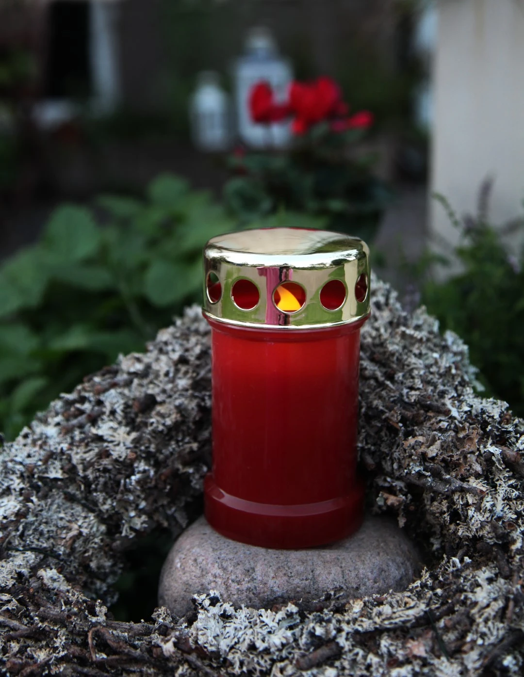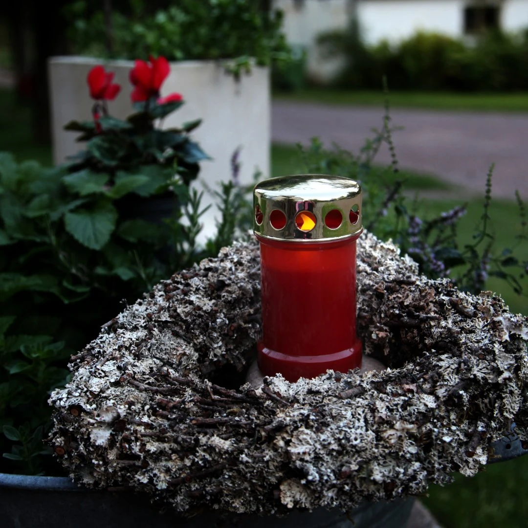 Czerwony znicz LED ustawiony na kamieniu, w otoczeniu wieńca i roślin ozdobnych, dający ciepłe światło.