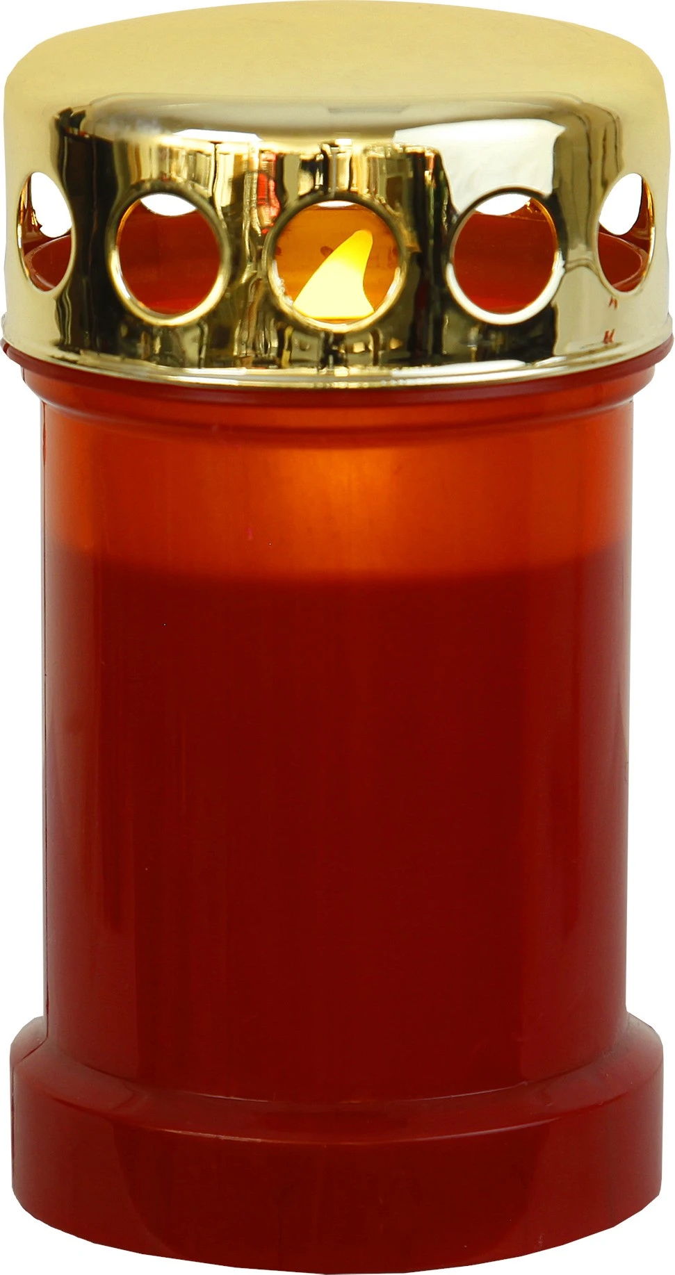 Zbliżenie czerwonego znicza LED z delikatnie migoczącym płomieniem i połyskującą złotą nakrywką.